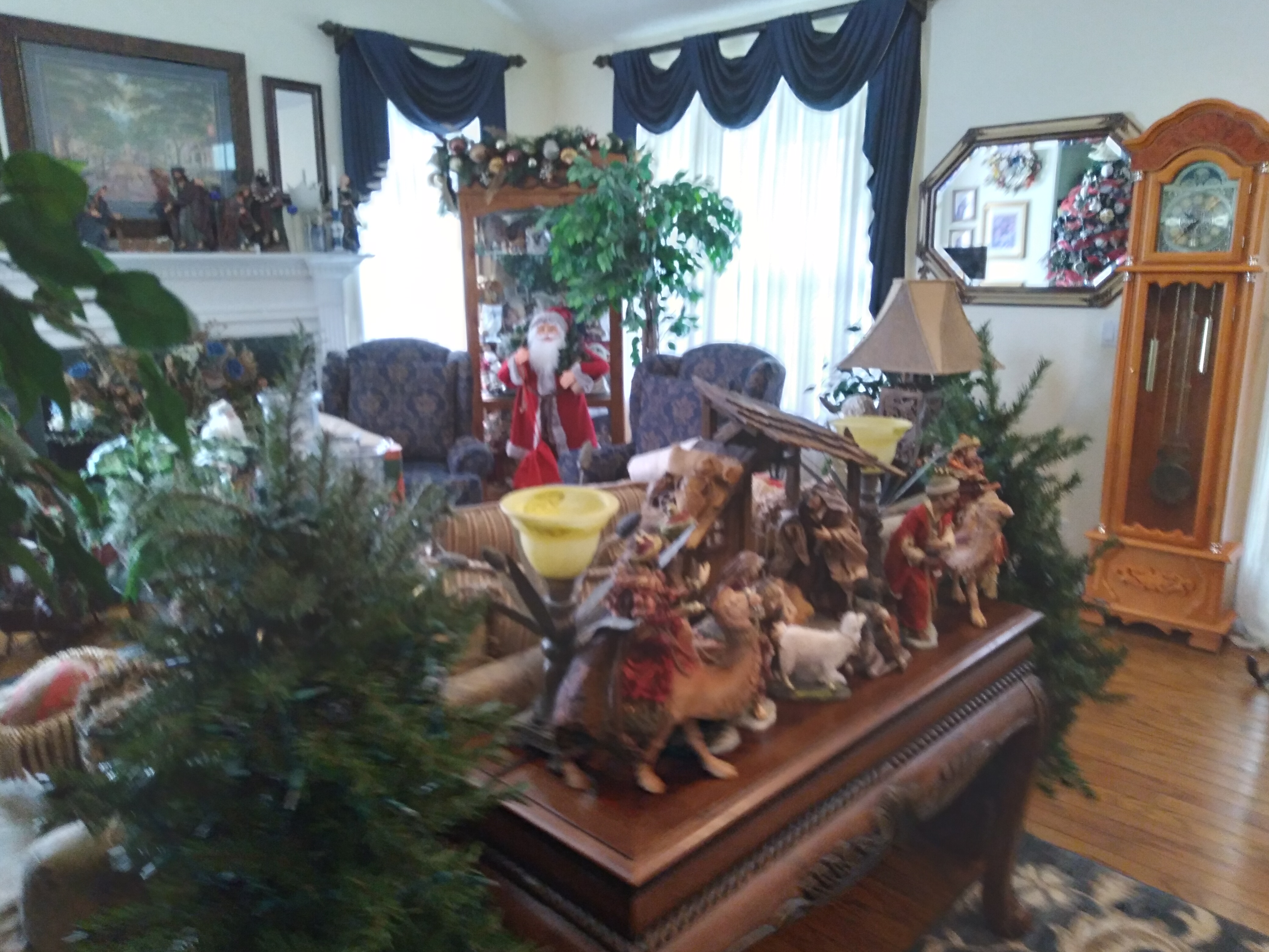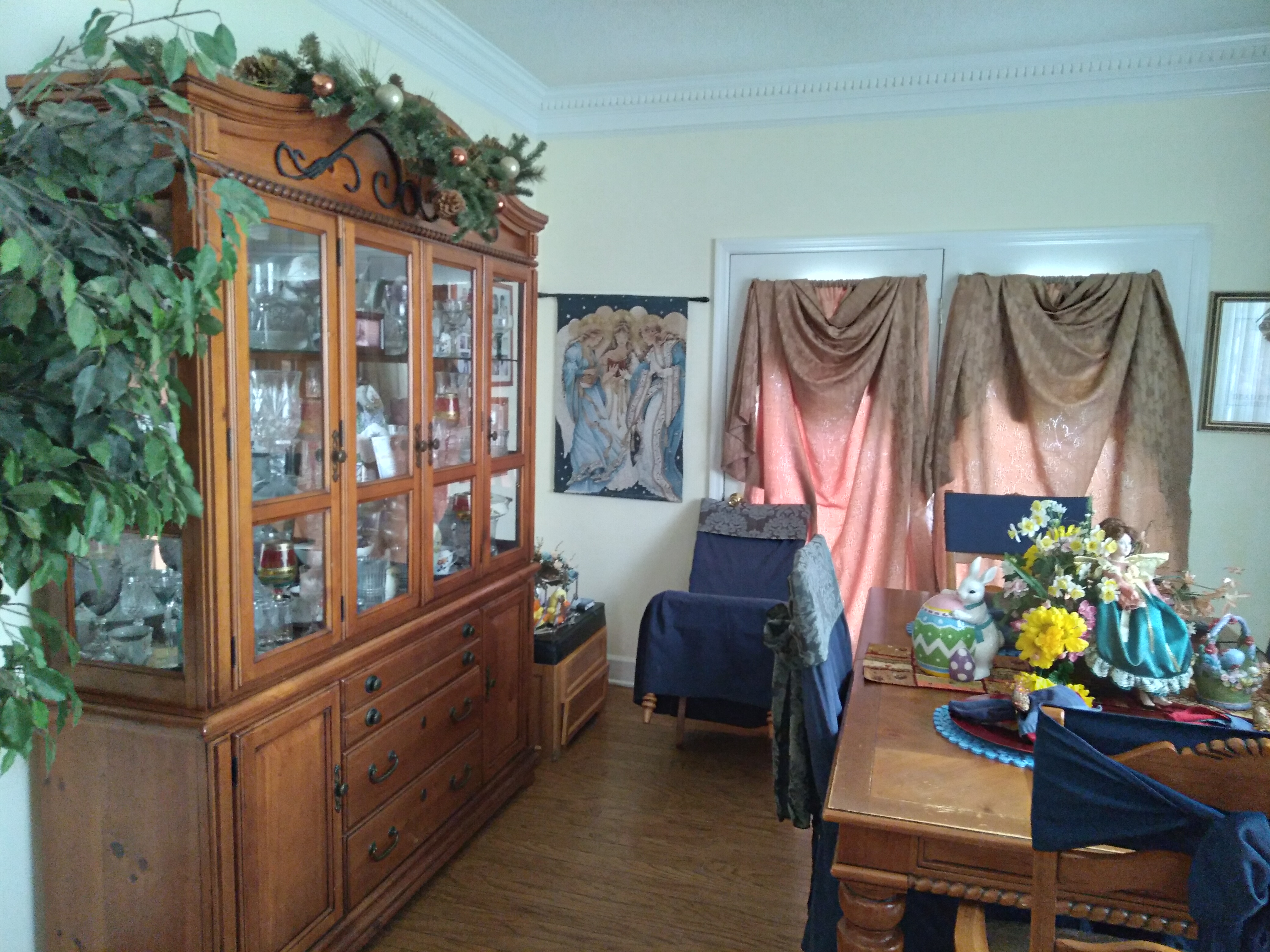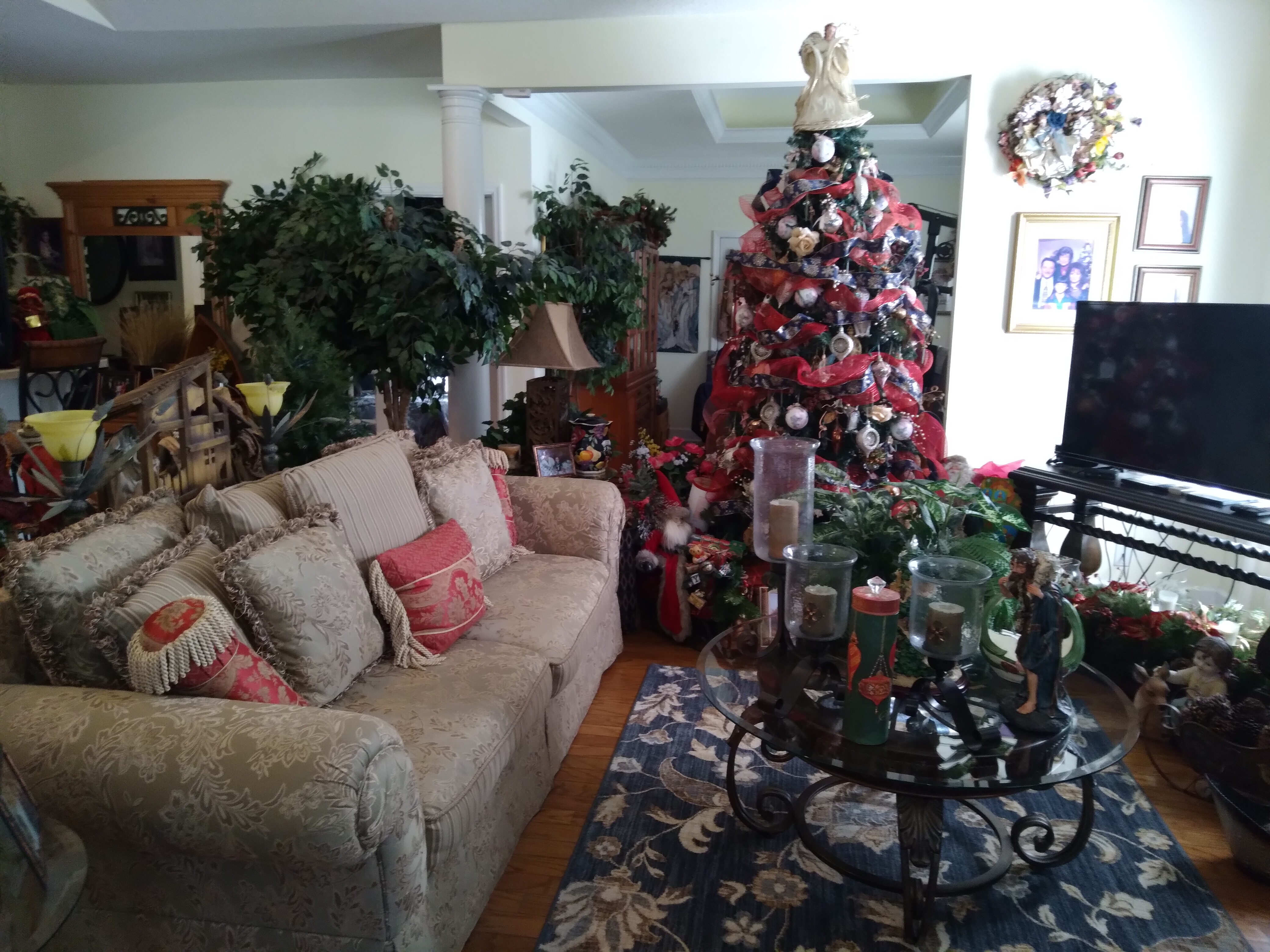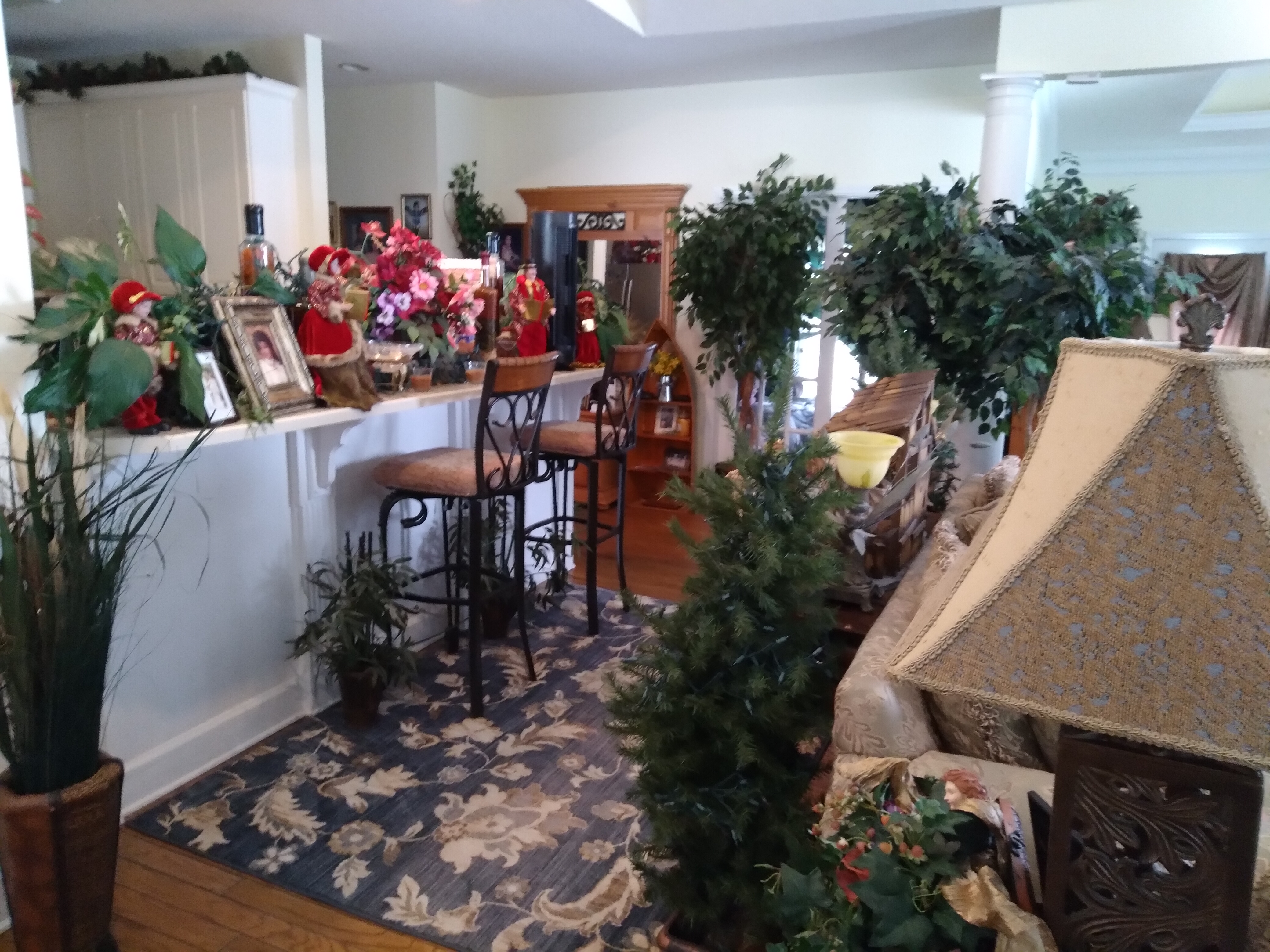 Couches, curio, bar stools, high back chairs, mabry gym set, dining room set, kitchen items and clothing