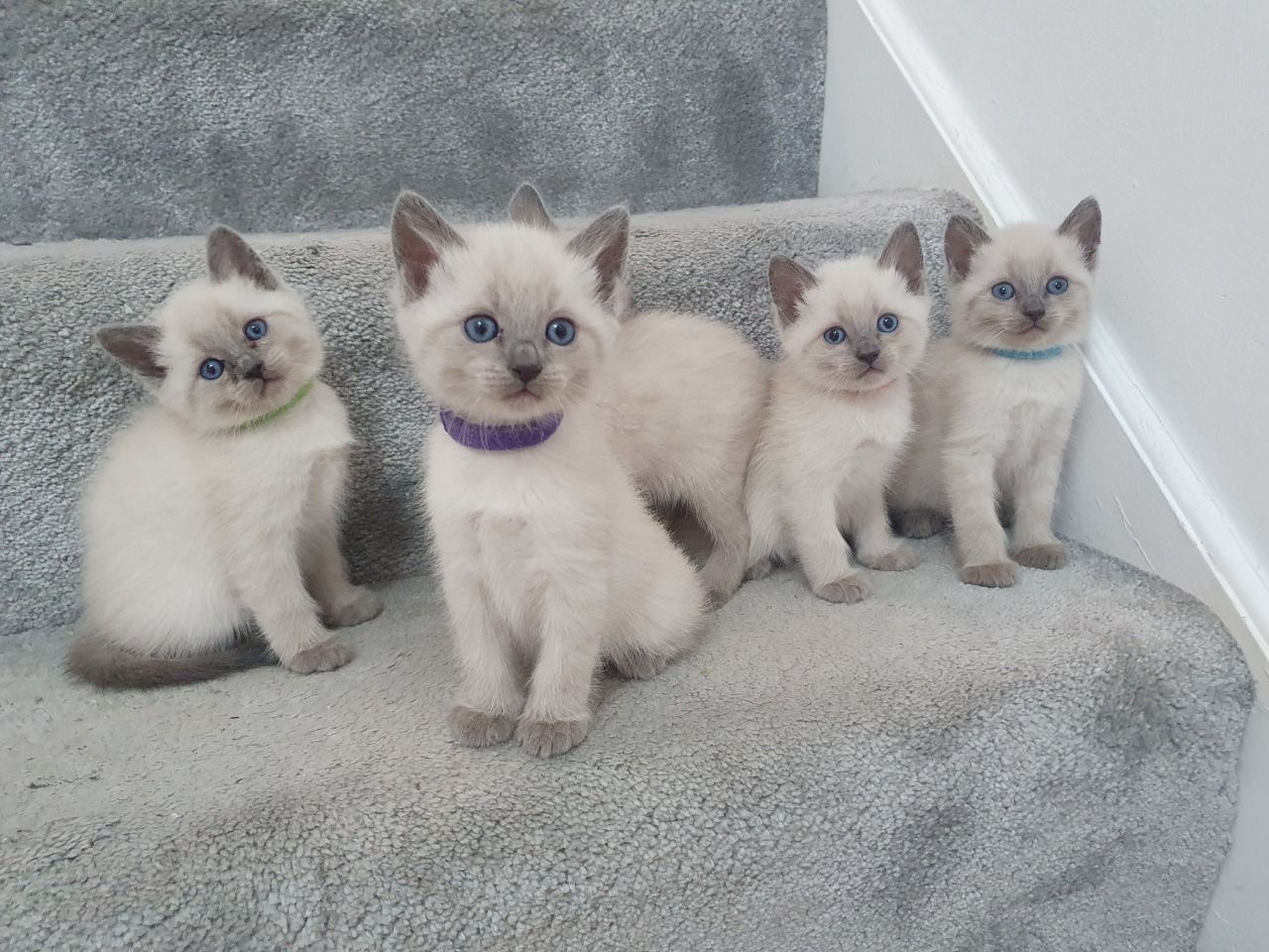 Welcome to my beautiful blue-eyed babies. 12 wks old, 1 chocolate,1 blue, and 2 Lilac. Litter trained flea and wormed come with pet Insurance. Brought up in the family home with mum and dad.